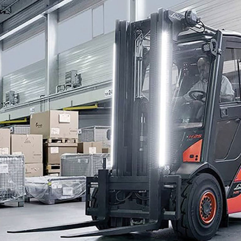 Le linee di avvertimento attirano automaticamente l’attenzione dei dipendenti e visualizzano l’area pericolosa ai lati di un carrello industriale.