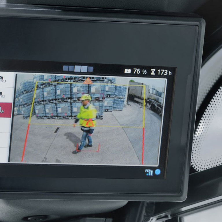 Sistema attivo di telecamere in grado di distinguere il personale a piedi da altri ostacoli in tempo reale. L’operatore riceve segnali sonori e luminosi sul monitor in dotazione a seconda della distanza a cui si trova il pedone. La funzione di avviso può essere combinata con la riduzione di velocità dei carrelli.